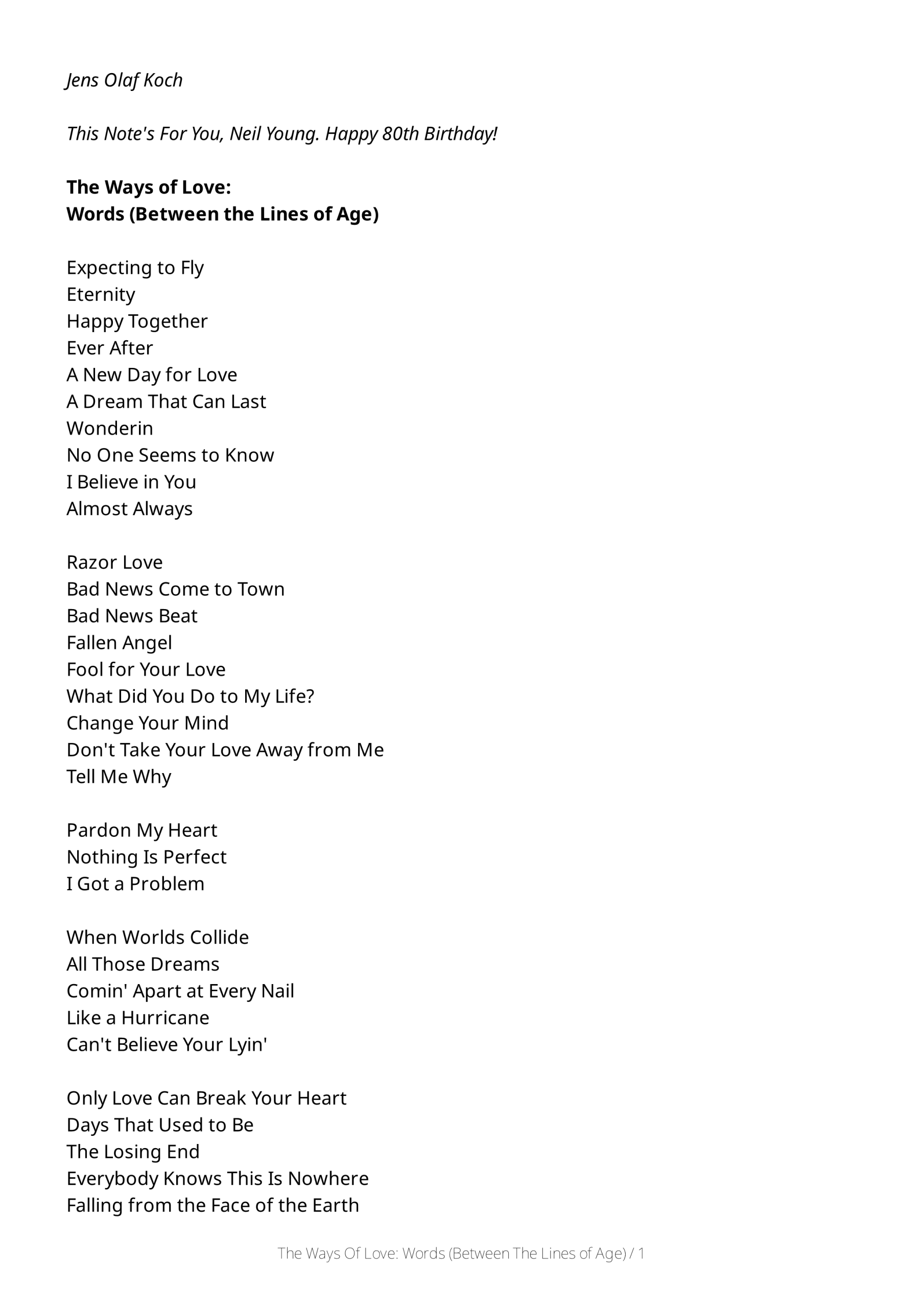 Neil Young at 80. A 3-page birthday greeting to the most essential musical influence of my life. A love story told in song titles.